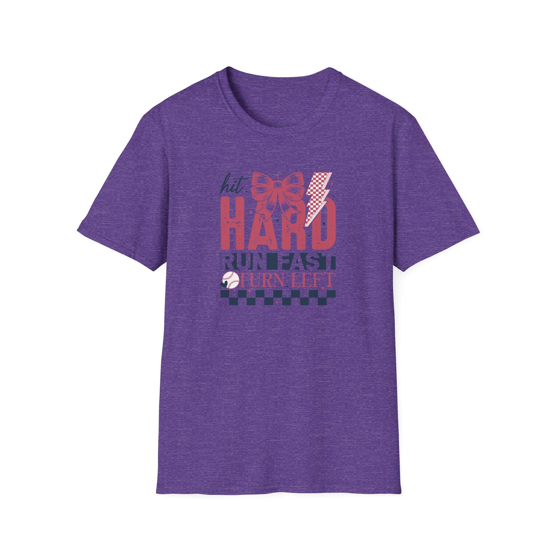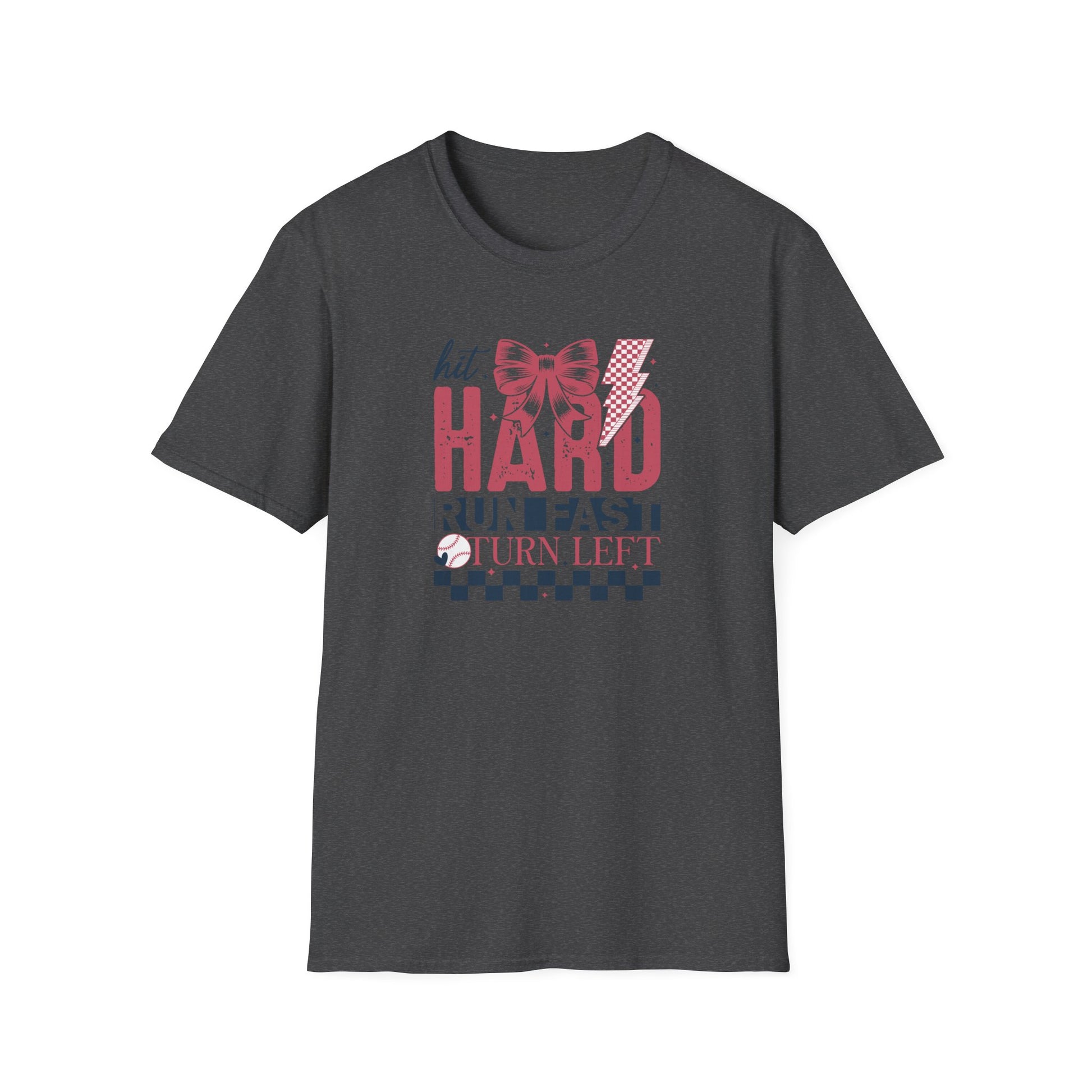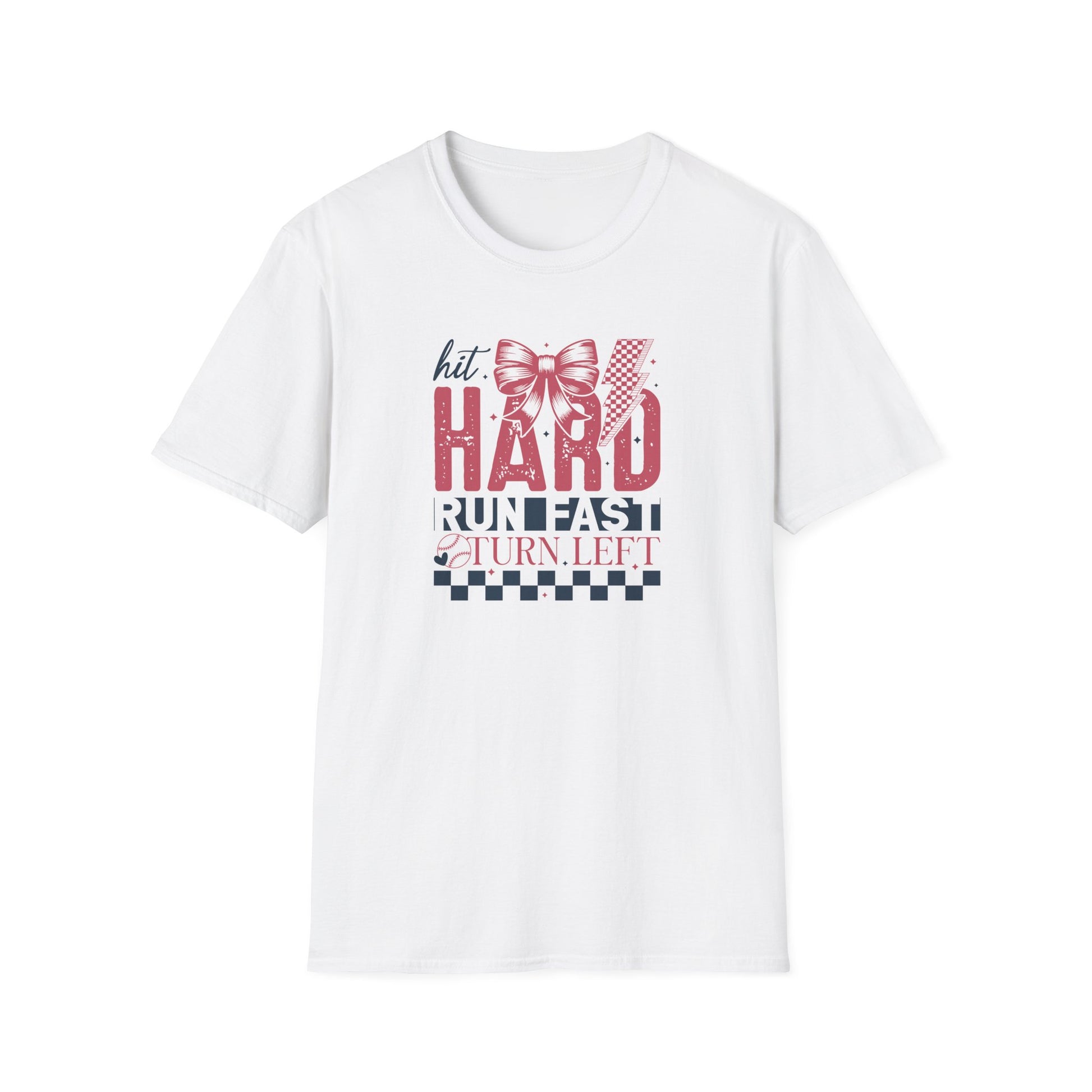 Hit Hard Run Fast Turn Left Baseball Shirt – Cute Softball Bow Tee | Game Day Shirt for Women | Sports Mom Graphic T-Shirt