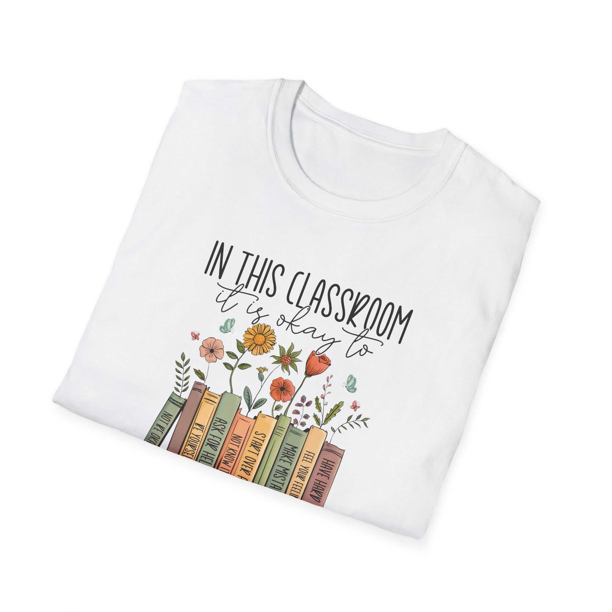 This beautifully designed teacher shirt features an inspiring “In This Classroom It Is Okay To” message paired with charming book and floral artwork — a perfect reflection of a safe and supportive learning environment.