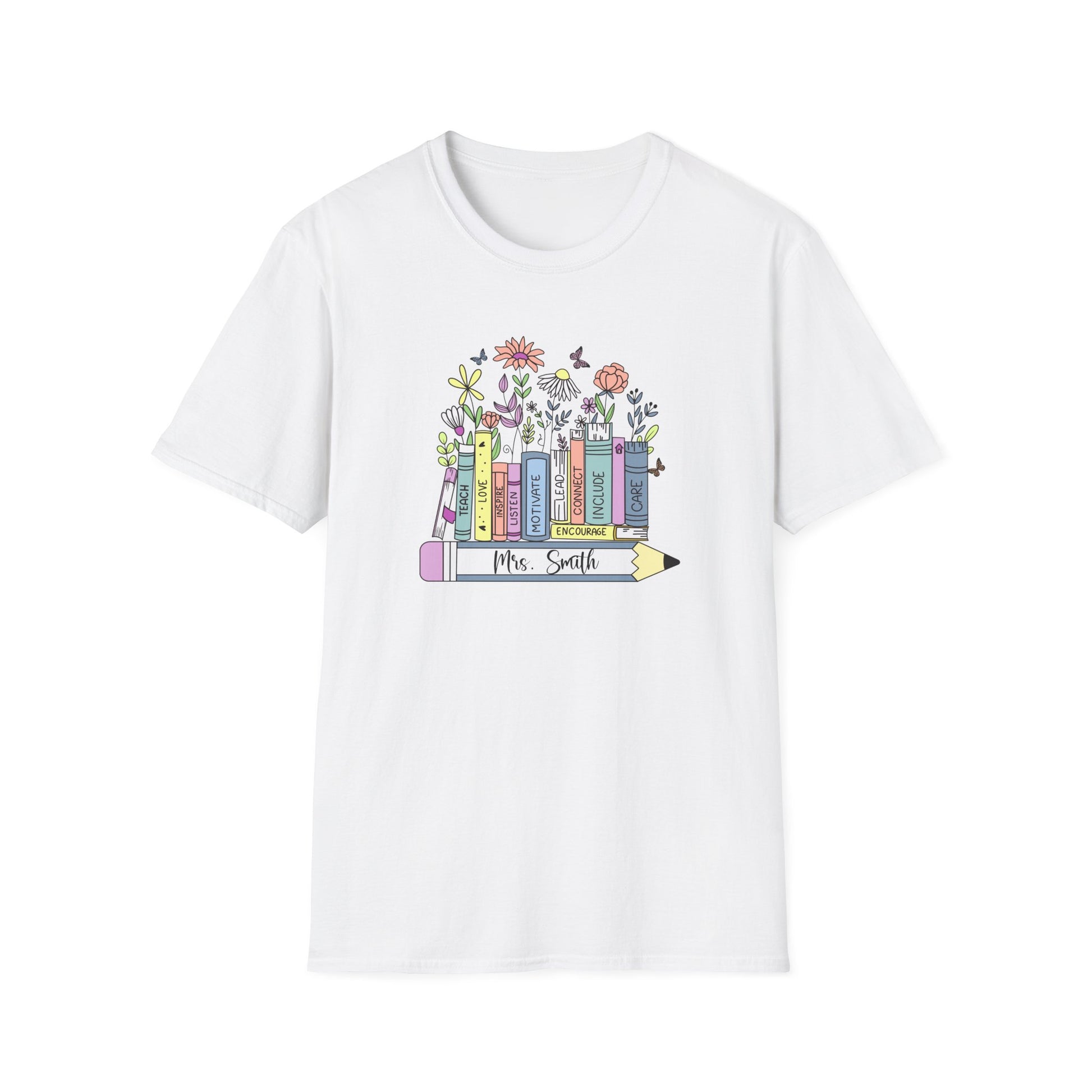 Personalized Teacher Shirt – Custom Name Floral Book T-Shirt – Mrs. Custom Pencil Tee – Teacher Appreciation Gift