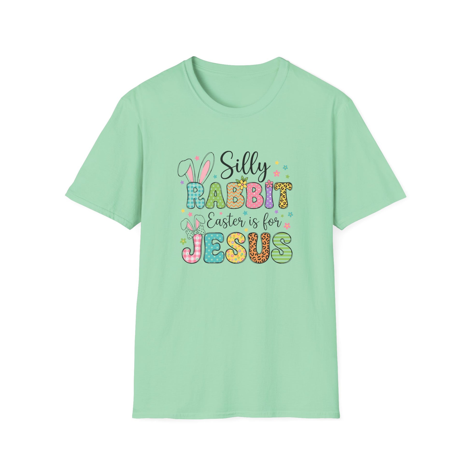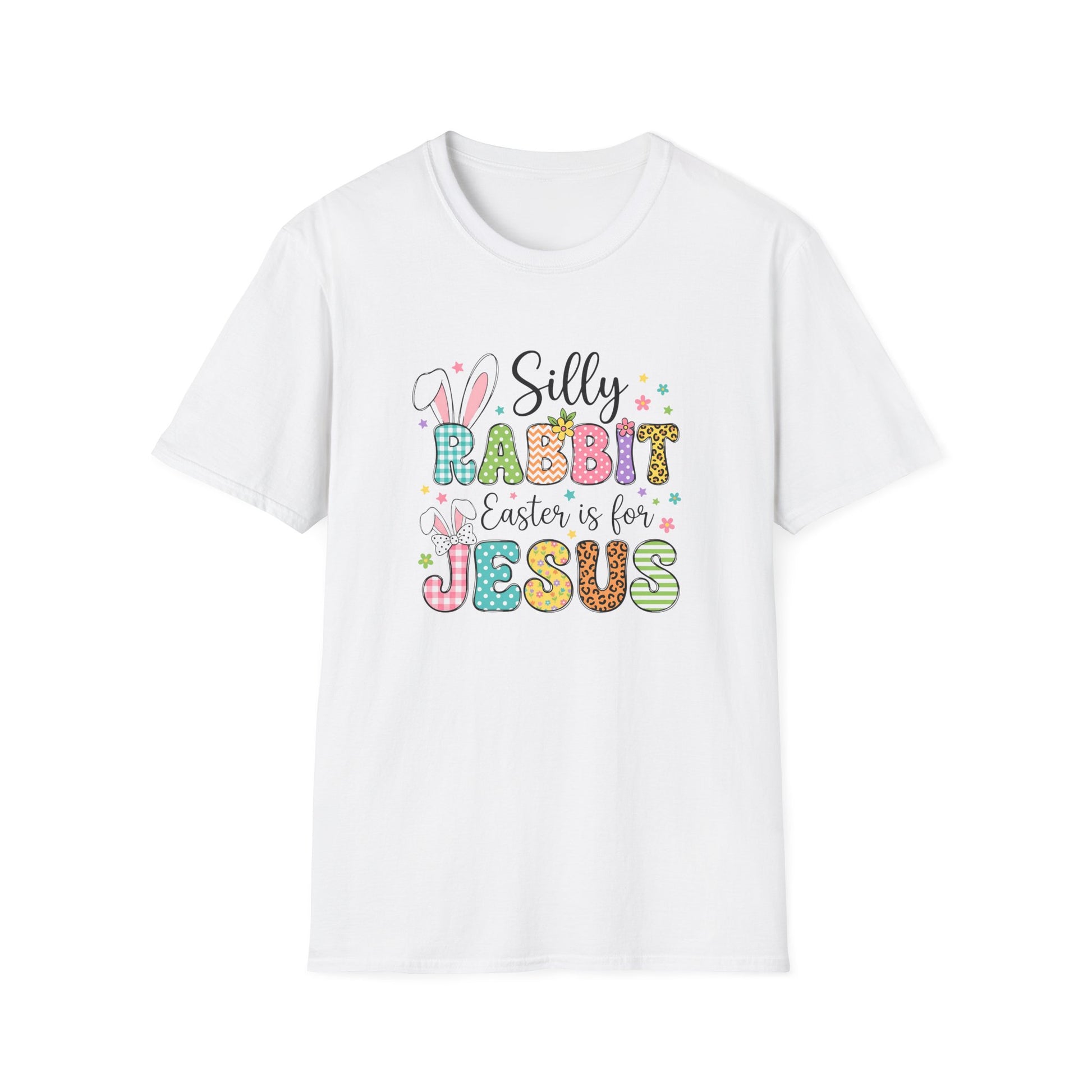 Add a playful touch to your faith-filled wardrobe with this adorable “Silly Rabbit Easter Is For Jesus” Christian Easter tee. Featuring colorful patterned lettering, sweet bunny accents, and cheerful spring vibes, this shirt is perfect for celebrating the true meaning of Easter while keeping your style fun and bright.