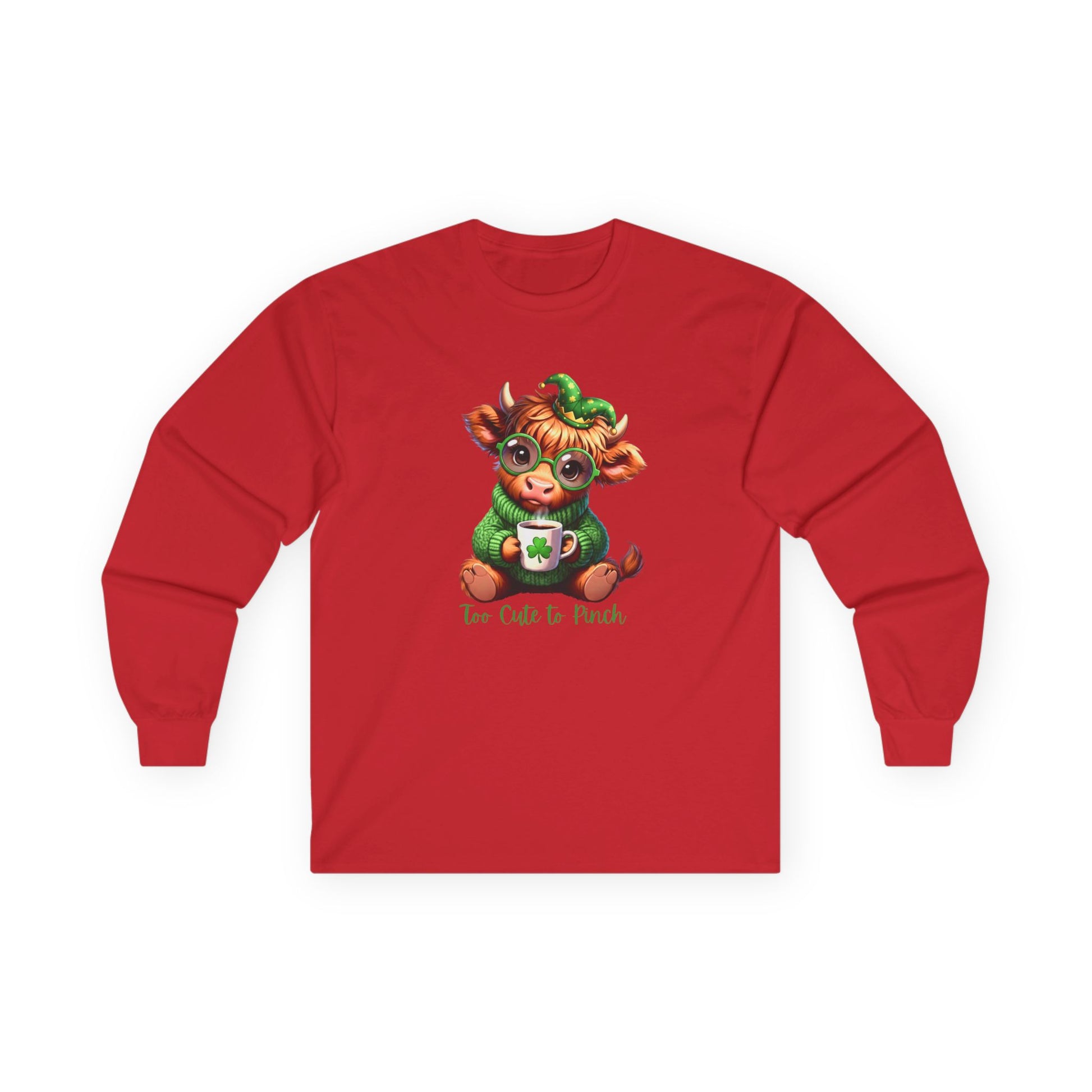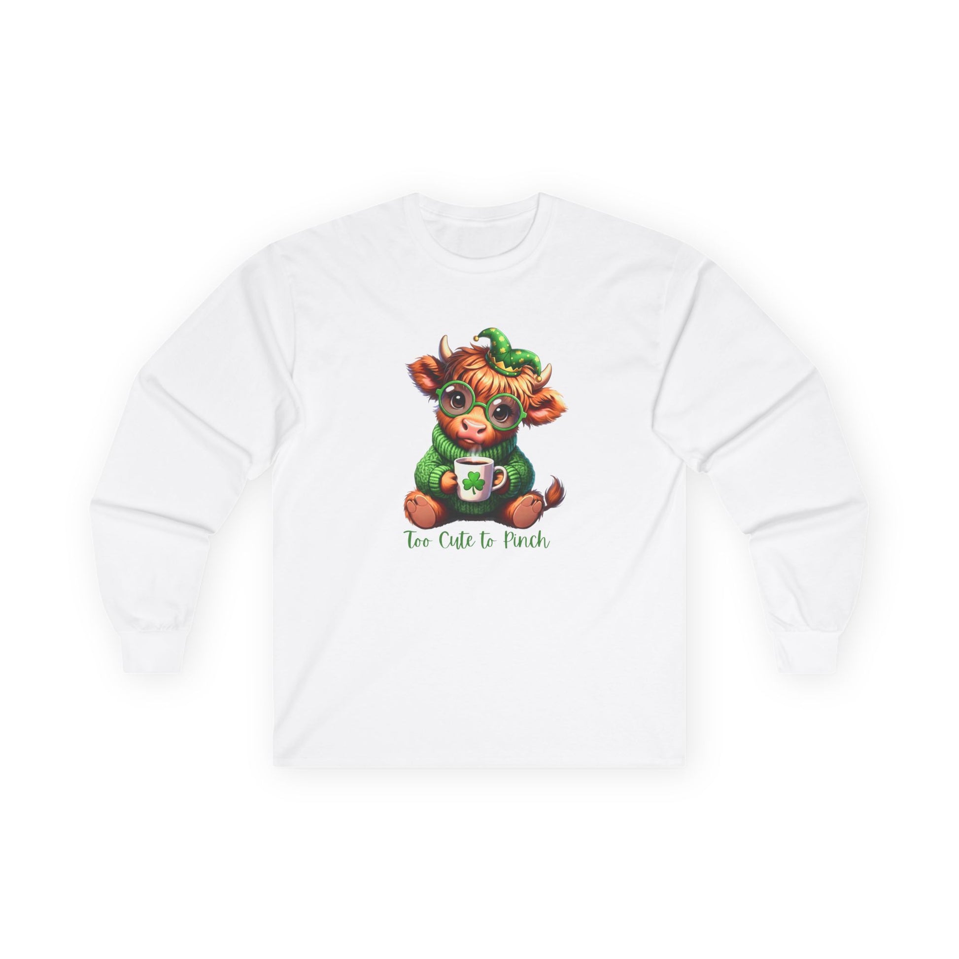 St. Patrick's Cozy Cow Long Sleeve Tee — 'Too Cute to Pinch'