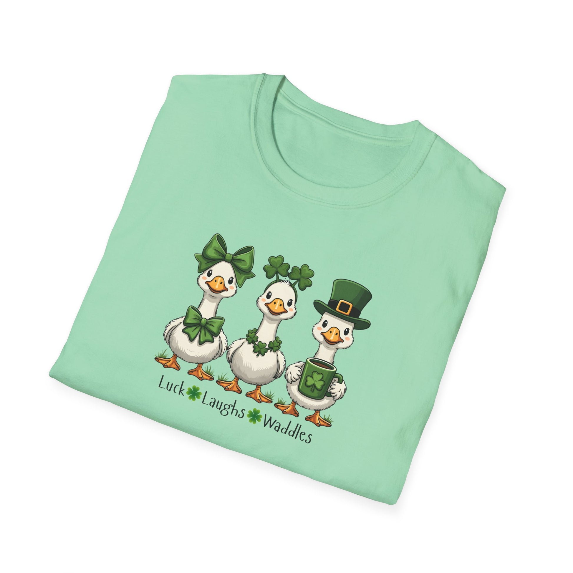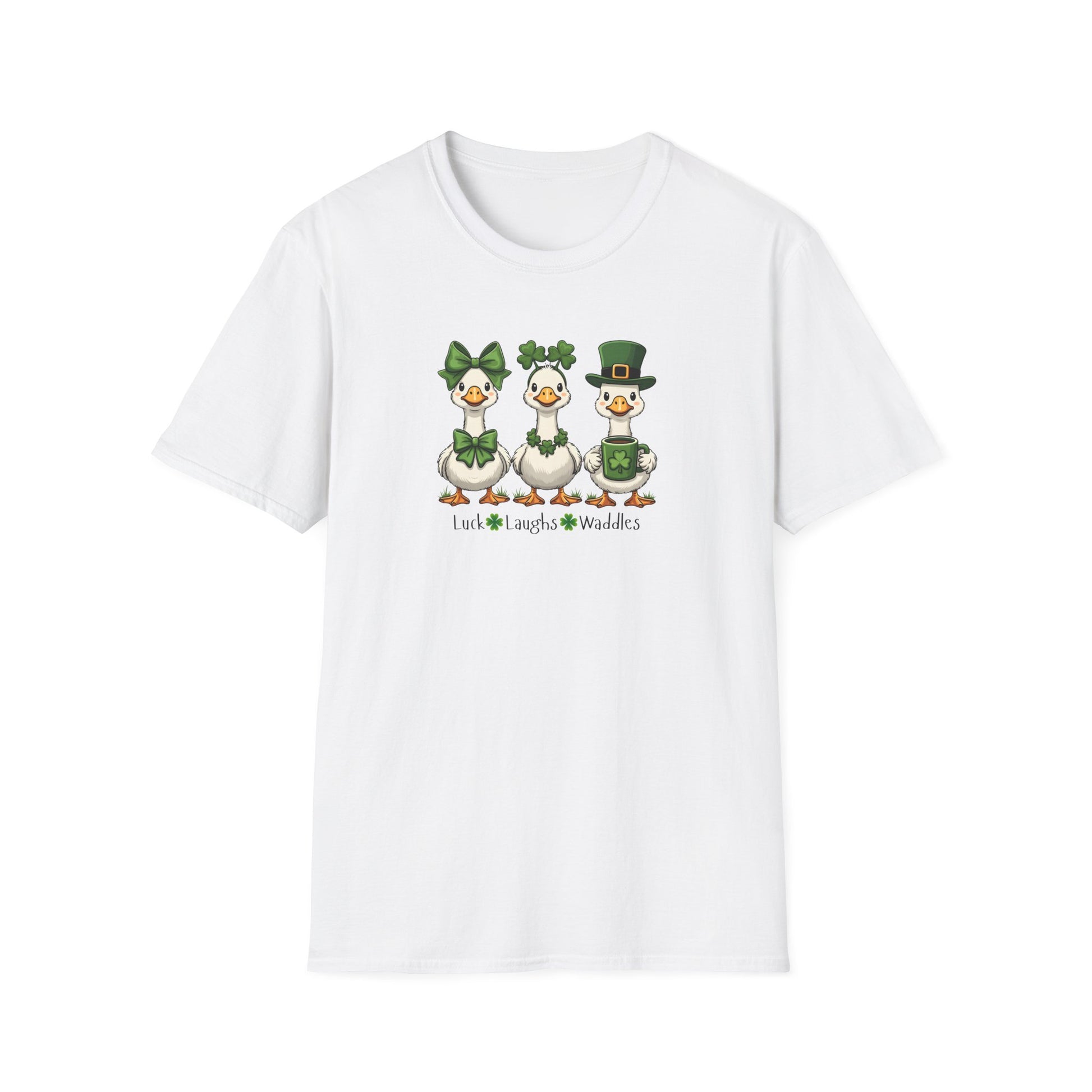 Three cheerful ducks waddle across the chest, each dressed in playful St. Patrick’s Day green — a shamrock bow, a leafy crown, and a tiny leprechaun hat. The illustration is lighthearted and slightly whimsical, with tiny clovers and a stitched line beneath that read like a stitched charm. This lightweight cotton tee slips into weekend routines: wear it to casual pub nights, neighborhood parades, or cozy mornings with a mug of tea. The soft ring-spun cotton feels gentle on the skin and keeps the colors crisp through many washes. It’s the kind of shirt that sparks smiles and quiet conversations — a simple, joyful nod to luck and togetherness.