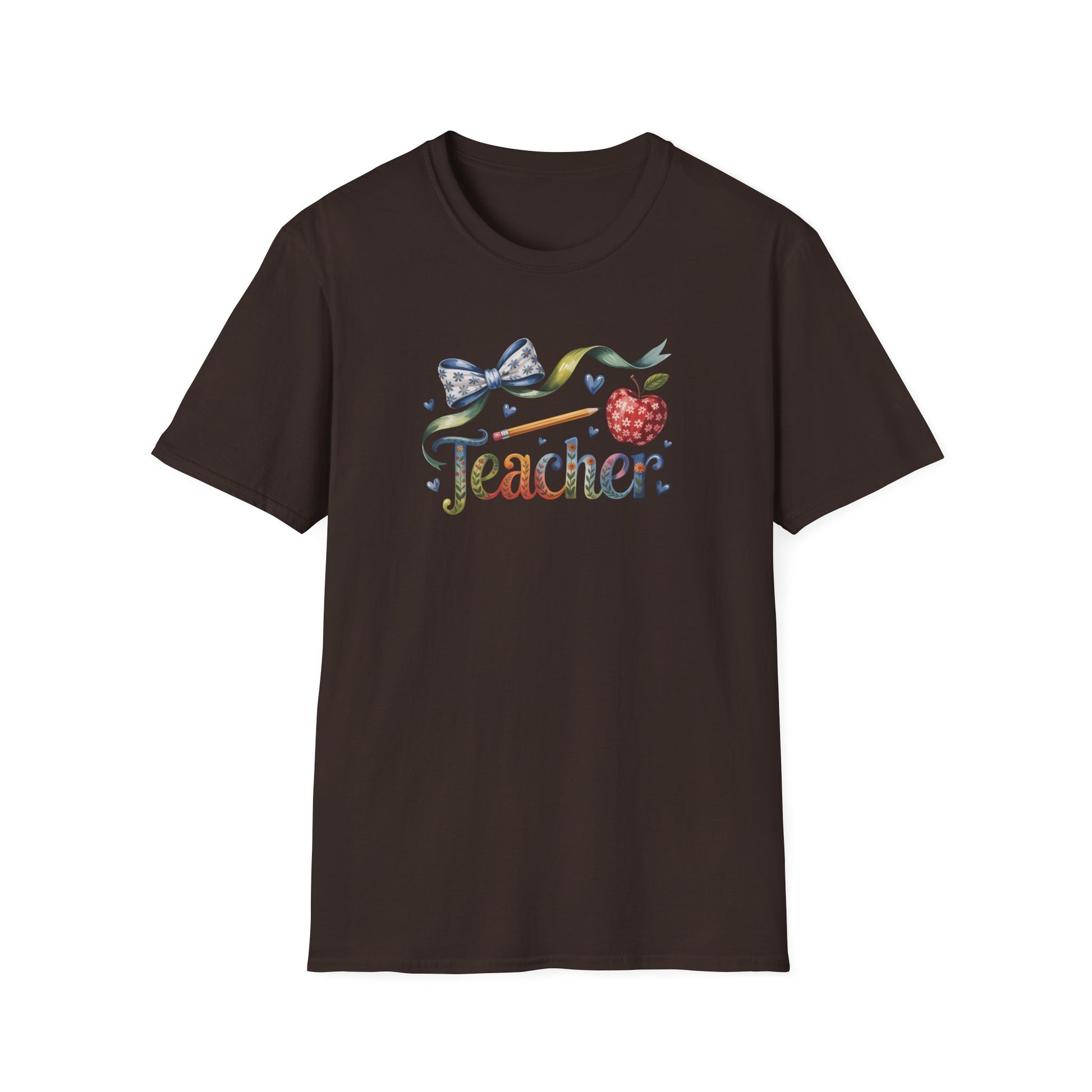 Soft, simple, and quietly cheerful — this lightweight tee holds a small, hand-painted feel illustration at the chest: a bow, leafy flourish, a polka-dot apple and the word “Teacher” in warm, watercolor tones. It sits close to the body without feeling tight, with a smooth cotton face that keeps colors bright and edges crisp. Wear it on parent–teacher nights, classroom field trips, or slow coffee mornings before the bell. The design reads like a note pinned on a corkboard: friendly, thoughtful, and a little bit nostalgic — the kind of shirt that starts conversations with colleagues and students alike.